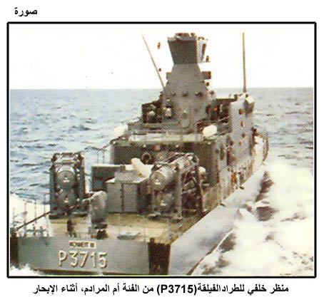 منظر خلفي للطراد الفيلقة (P3715) من الفئة أم المرادم، أثناء الإبحار