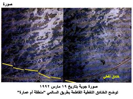 صورة جوية بتاريخ 19 مارس 1992، توضح الخنادق النفطية القاطعة بطريق السالمي "منطقة أم عمارة".