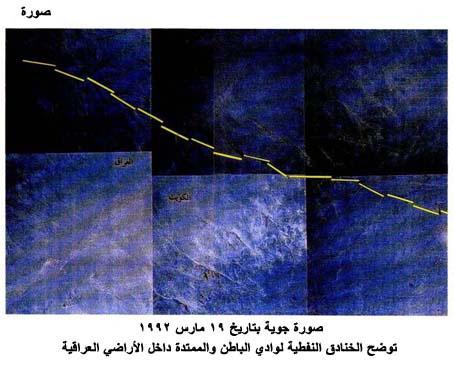 صورة جوية بتاريخ 19 مارس 1992، توضح الخنادق النفطية القاطعة لوادي الباطن والممتدة داخل الأراضي العراقية