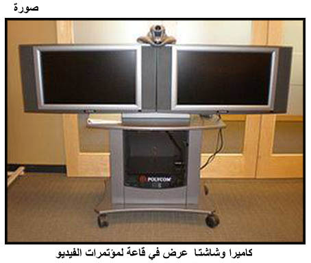 كاميرا وشاشتا عرض في قاعة لمؤتمرات الفيديو