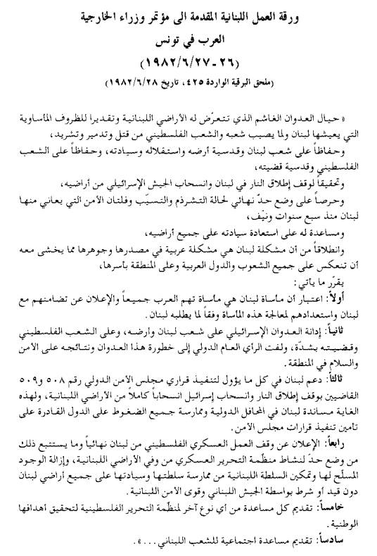 ورقة العمل اللبنانية في 26 ـ 27 يونيه 1982