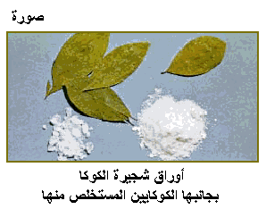 أورق شجرة الكوكا وبجانبها الكوكايين المستخلص منها