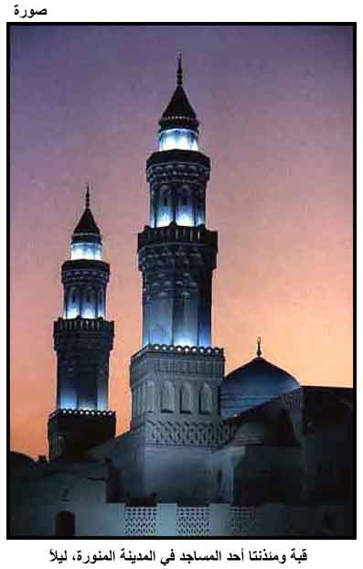 قبة ومئذنتا أحد المساجد في المدينة المنورة، ليلاً