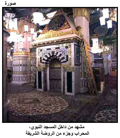 مشهد من داخل المسجد النبوي، المحراب وجزء من الروضة الشريفة