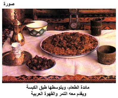 مائدة الطعام، ويتوسطها طبق الكبسة ويقدم معه التمر والقهوة العربية