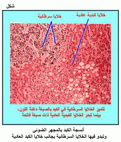 أنسجة الكبد بالمجهر الضوئي وتبدو فيها الخلايا السرطانية بجانب خلايا الكبد العادية