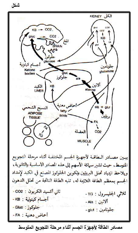 مصادر الطاقة للأجهزة الجسم أثناء مرحلة التجويع المتوسط