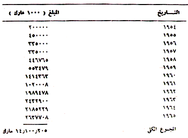 وبلغ مجموع ما دفعته الممثلية التجارية الإسرائيلية فى ألمانيا الى الاتحاد الألمانى من مبالغ (الأرباح) ما يقارب 14 مليون مارك للفترة الواقعة ما بين عام 1954 وعام 1965، موزعة على الشكل التالى:
