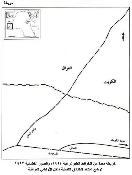 خريطة معدة من الخرائط الطبوغرافية 1994، والصور الفضائية 1992 توضح امتداد الخنادق النفطية داخل الأراضي العراقية.