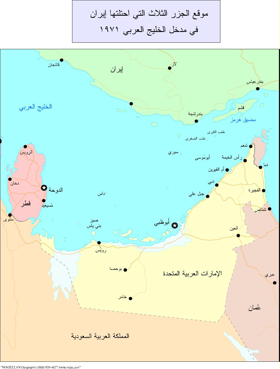 موقع الجزر الثلاث التي احتلتها إيران في مدخل الخليج العربي 1971