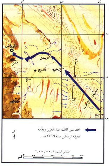 خط سير الملك عبد العزيز ورفاقه لمعركة الرياض سنة 1319 هـ